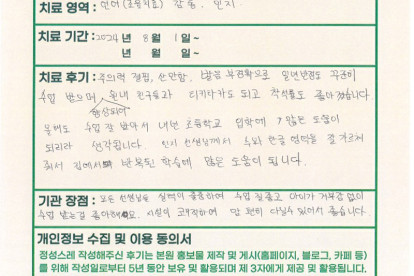 김**님은 용인이엠365의원에서 언어, 감통 치료를 받으셨습니다.다음은 김**님 부모님께서 직접 작성해주..